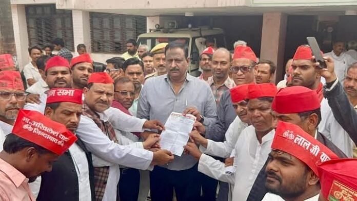 बांसी सिद्धार्थनगर। सिद्धार्थनगर में पिछले दिनों करणी सेना द्वारा बांसी में समाजवादी पार्टी के राष्ट्रीय अध्यक्ष तथा समाजवादी पार्टी के वरिष्ठ नेता सांसद रामजीलाल सुमन जी के विरुद्ध आपत्तिजनक टिप्पणी तथा पुतला जलाने के विरोध में बुधवार को 304 बांसी विधानसभा द्वारा समाजवादी पार्टी के जिला अध्यक्ष लाल जी यादव के अगुवाई तथा नगर अध्यक्ष बांसी कपिल देव जी के अध्यक्षता में तहसील बांसी परिसर में उप जिलाधिकारी बांसी के माध्यम से महामहिम राज्यपाल के नाम धरना प्रदर्शन कर कार्यवाही की मांग करते हुए सपा जिला अध्यक्ष लालजी यादव ने कहा कि भाजपा की सरकार जनहित के हर मोर्चे पर विफल है पूरे प्रदेश में महंगाई बेरोजगारी से हाहाकार मचा हुआ है पूरे प्रदेश में अराजकता का बोलबाला है नौजवान बेहाल है किसान बदहाल है