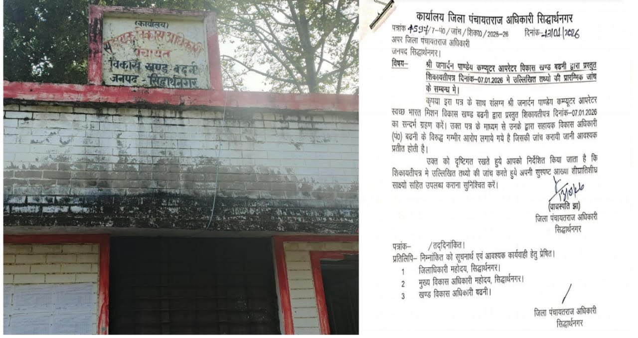 जिसके संबंध में जिला पंचायत राज अधिकारी वाचस्पति झा द्वारा अपर जिला पंचायत राज अधिकारी को जनार्दन पाण्डेय कम्प्यूटर आपरेटर स्वच्छ भारत मिशन विकास खण्ड बढनी द्वारा शिकायतीपत्र में उल्लिखित तथ्यों की जांच कर अपनी सुस्पष्ट आख्या शीघ्र साक्ष्यो सहित उपलब्ध कराने का दिशा-निर्देश जारी किया गया है।