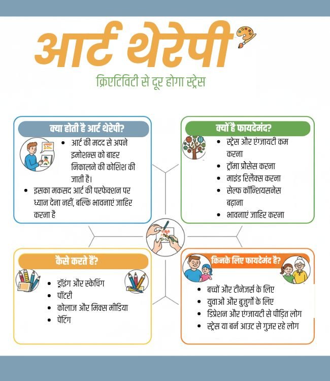 क्या आप जानते हैं आर्ट भी आपके दिमाग को शांत करने और भावनाओं को जाहिर करने में मदद कर सकती है? जी हां, इसे आर्ट थेरेपी (Art Therapy) कहते हैं, जो स्ट्रेस और एंग्जायटी से राहत दिलाने में काफी मदद करती है। आज की जिंदगी में जहां तनाव हमारा साथी बन चुका है, आर्ट थेरेपी काफी कारगर साबित हो सकती है।