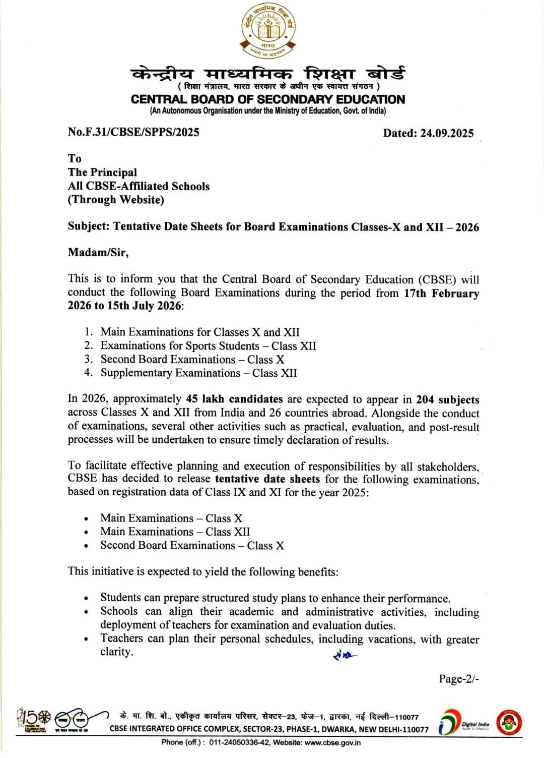केन्द्रीय माध्यमिक शिक्षा बोर्ड (CBSE) की ओर से कक्षा 10वीं और 12वीं की बोर्ड परीक्षाओं की टेंटेटिव डेटशीट जारी कर दी है। सीबीएसई की आधिकारिक अधिसूचना के मुताबिक कक्षा 10वीं और 12वीं की बोर्ड परीक्षा 17 फरवरी, 2026 से लेकर 15 जुलाई, 2026 तक आयोजित कराई जाएगी।