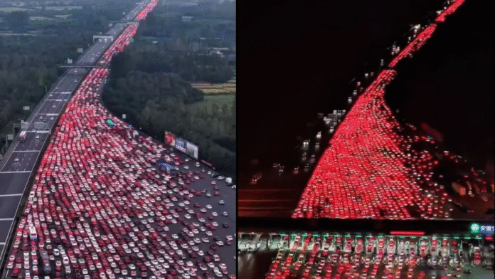 चीन के अनहुई प्रांत के सबसे बड़े टोल स्टेशन पर सोमवार, 6 अक्टूबर को राष्ट्रीय दिवस और मध्य-शरद उत्सव की आठ दिनों की छुट्टियों के बाद लाखों यात्रियों के घर लौटने के दौरान भारी ट्रैफिक जाम लग गया। वुझुआंग टोल स्टेशन पर वाहनों की कतारों के वीडियो सोशल मीडिया पर वायरल हो रहे हैं।