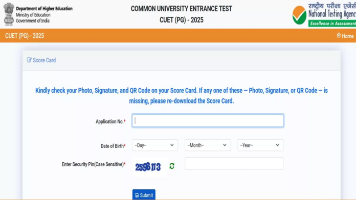 वेबसाइट के होम पेज पर LATEST NEWS में CUET (PG) – 2025 : Click Here to Download Score Card पर क्लिक करें।