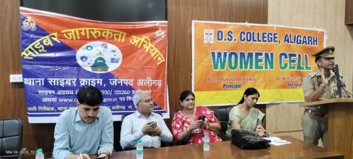 अलीगढ़। धर्म समाज महाविद्यालय अलीगढ़ में बुधवार को उत्तर प्रदेश पुलिस प्रशासन के तत्वावधान में महिला प्रकोष्ठ, एन सी सी, एन एस एस द्वारा साइबर जागरूकता अभियान का आयोजन किया गया। कार्यक्रम की शुरुआत प्राचार्य प्रो.मुकेश कुमार भारद्वाज एवं सभी अतिथियों ने मां सरस्वती की प्रतिमा माल्यार्पण एवं दीप प्रज्ज्वलित कर किया।