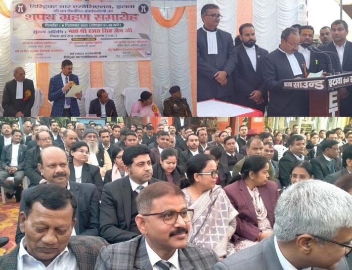 इटावा। जिला बार एसोसिएशन की नवनिर्वाचित कार्यकारिणी का सोमवार को शपथ ग्रहण कार्यक्रम संपन्न हुआ।डीबीए के नवनिर्वाचित पदाधिकारियों को मुख्य अतिथि जनपद न्यायाधीश रजत सिंह जैन ने शपथ दिलाई,विशिष्ट अतिथि के तौर पर सदर विधायक श्रीमती सरिता भदौरिया जिलाधिकारी शुभ्रांत कुमार शुक्ल और अभयनाथ त्रिपाठी अपर पुलिस अधीक्षक मौजूद रहे।कार्यक्रम जिला कलेक्ट्रेट परिसर के इंदिरा चौक में संपन्न हुआ।