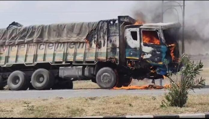 उरई (जालौन)। जिले के एट थाना क्षेत्र अंतर्गत गिरथान गांव के पास एक खड़े ट्रक में अचानक आग लग गई। अज्ञात कारणों के चलते लगी इस आग ने कुछ ही देर में पूरे ट्रक को अपनी चपेट में ले लिया और वाहन धू-धू कर जलता रहा। बताया गया है कि ट्रक दो दिन पहले एक हादसे का शिकार हुआ था जिसमें 6 लोगों की मौत भी हुई थी।पलटे पड़े ट्रक को हाइवे किनारे खड़ा किया गया। जिसके कुछ देर बाद अचानक उसमें आग लग गई।