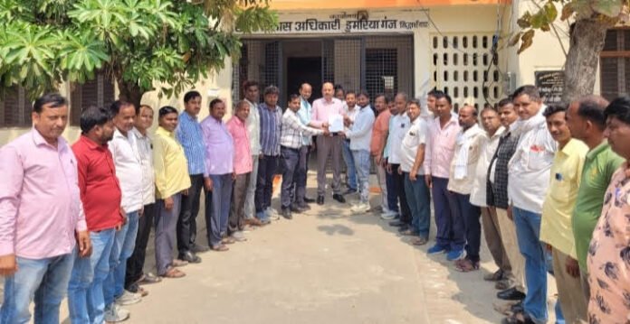 डुमरियागंज सिद्धार्थनगर। विकास खंड डुमरियागंज में तैनात रोजगार सेवक संघ के ब्लॉक अध्यक्ष कुलदीप सोनी के नेतृत्व शनिवार को प्रांतीय संघ की आवाहन पर इकट्ठा होकर खंड विकास अधिकारी के गैर मौजूदगी में सहायक विकास अधिकारी (पंचायत) डुमरियागंज को अपनी मांगों लेकर ज्ञापन सौंपा हुए कहां कि संख्या संगठन के मांगों पर विचार नहीं किया गया तो बड़े पैमाने पर प्रदेश स्तर विशाल धरना प्रदर्शन किया जाएगा।