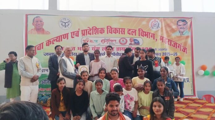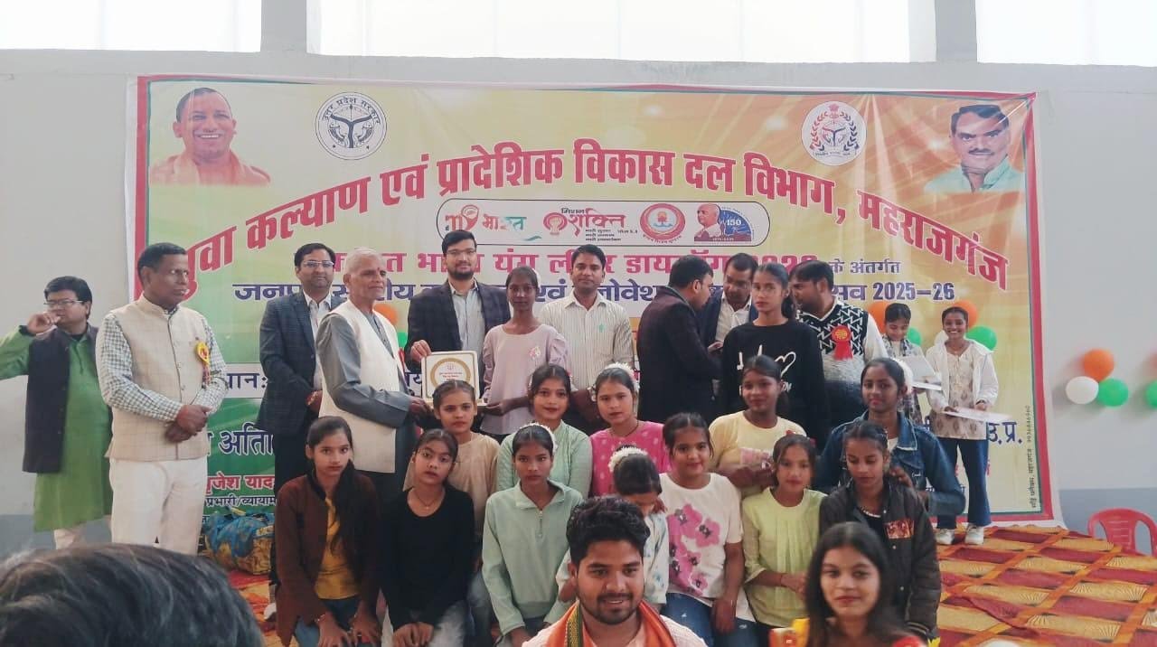 महराजगंज। युवा कल्याण विभाग द्वारा शनिवार को कल्चरल एवं इनोवेशन ट्रैक जनपद स्तरीय युवा उत्सव का भव्य आयोजन महंत दिग्विजयनाथ बहुउद्देशीय इनडोर स्टेडियम, चौक में किया गया। कार्यक्रम का शुभारंभ मुख्य अतिथि विभ्राट चंद कौशिक, उपाध्यक्ष युवा कल्याण परिषद उत्तर प्रदेश ने मां सरस्वती के चित्र पर माल्यार्पण व दीप प्रज्वलन कर किया। इस अवसर पर जिला युवा कल्याण अधिकारी वैभव सिंह ने मुख्य अतिथि का पुष्पगुच्छ व स्मृति चिन्ह देकर स्वागत किया।