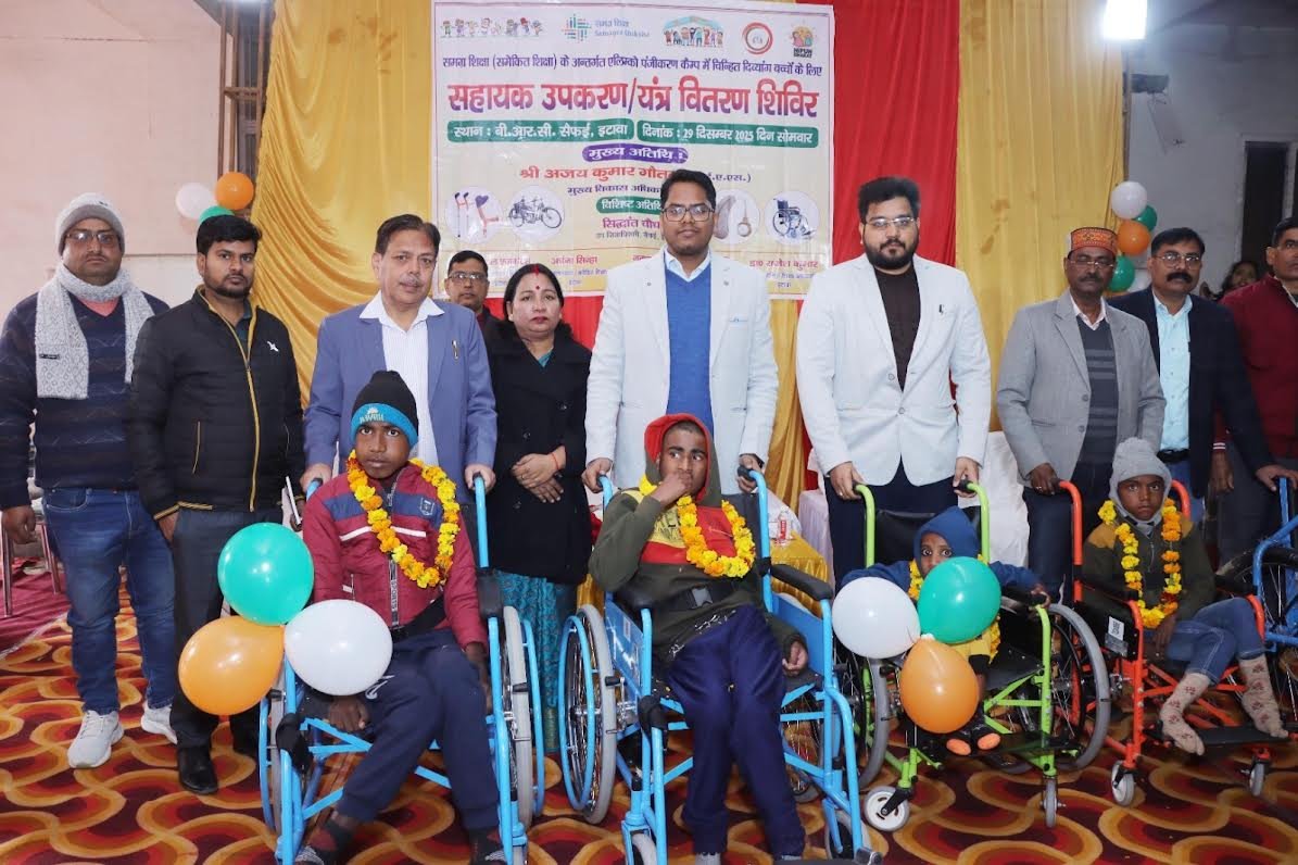 इटावा। ब्लांक संसाधन केन्द्र सैफई में समग्र शिक्षा समेकित शिक्षा के अन्तर्गत 6 से 14 वर्ष के विशिष्ट आवश्यकता वाले (दिव्यांग),जिन्हें चलने,उठने बैठने में तथा दृष्टि से समस्या ग्रस्त बच्चों के लिए तथा सुनने में अक्षम(श्रवणबाधित)बच्चों के लिए सोमवार को सहायक उपकरण/यन्त्र वितरण शिविर का आयोजन किया गया।कार्यक्रम का आयोजन जिला बेसिक शिक्षा अधिकारी डाॅ.राजेश कुमार के निर्देशन में जिला समन्वयक(समेकित शिक्षा)श्रीमती अर्चना सिन्हा एवं खण्ड शिक्षा अधिकारी नवाब वर्मा के द्वारा तथा एलिम्को कानपुर से आये दिव्यांगता विशेषज्ञ पिन्टू कुमार तथा ऑडियालाजिस्ट विशेषज्ञ और कैलीपर्स विशेषज्ञ द्वारा उपकरण के लिए चिन्हित बच्चों को उपकरण वितरित किये गए।मुख्य अतिथि अजय कुमार गौतम मुख्य विकास अधिकारी तथा विशिष्ट अतिथि लक्ष्मीकान्त त्रिपाठी जिला दिव्यांगजन सशक्तीकरण अधिकारी तथा गौरव पुरोहित खण्ड विकास अधिकारी के द्वारा कार्यक्रम का शुभारम्भ सरस्वती माॅ पर माल्यार्पण कर व दीप प्रज्जवलित कर किया गया। जिला समन्वयक समेकित शिक्षा व खण्ड शिक्षा अधिकारी नवाब वर्मा के द्वारा मुख्य अतिथि को एवं रिसोर्स टीचर प्रहलाद कुमार द्वारा विशिष्ट अतिथियों को बुके व प्रतीक चिन्ह देकर सम्मानित किया गया और प्रहलाद कुमार,अवधेश सिंह,अनिल कुमार व खण्ड शिक्षा अधिकारी द्वारा माल्यार्पण कर स्वागत किया गया।मुख्य अतिथि द्वारा बच्चों को आशीर्बचन देते हुए कहाॅ कि आपको स्कूल आने व जाने में जो असुविधा हो रही थी आज इस उपकरण के प्रयोग से आपको शिक्षण-प्रशिक्षण में काफी सुविधा होगी और इस उपकरण के सहारे आप शिक्षा की मुख्यधारा से जुड़ सकेगें। दिव्यांगता अभिशाप नही है।