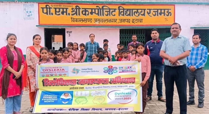 पी0एम0श्री कम्पो0विद्यालय रजमऊ,जसवन्तनगर तथा पी0एम0श्रीकम्पो0विद्यालय काॅधनी, बढपुरा में जागरूकता अभियान के अन्तर्गत बताया गया कि स्पेसिफिक लर्निंग डिसआर्डर/डिसेबीलिटी की पहचान में रिडिंग,राईटिंग एवं अर्थमेटिंग में होने वाली समस्याओं से डिस्लेक्सिया की पहचान की जा सकती है।बच्चा कक्षा 3 या 8 वर्ष या 8 वर्ष से उपर का हो, बच्चें की सुनने तथा देखने की क्षमता अच्छी हो,बच्चा चश्मा का प्रयोग करने के उपरान्त अच्छे से देख पा रहा हो।बच्चा भावनात्क एवं व्यवहरात्मक समस्या से ग्रसित न हो,चंचल या हाईपर एक्टिव न हो।बच्चा घबराहट के कारण किसी कार्य को बार-बार दोहराता न हो।डिस्लेक्सिया जागरूकता कार्यक्रम के अन्तर्गत प्रा0वि0भीखनपुर,ताखा,उ0प्रा0वि0 नगला लोहा सैफई,प्रा0वि0रम्पुरा बसरेहर में इस प्रकार की बच्चों की अनेक समस्याओं और बातों को ध्यान में रखते हुए स्पेशल एजूकेटर्स के माध्यम से परिषदीय विद्यालयों में अभिभावकों को डिस्लेक्सिया के अन्तर्गत जागरूक किया जा रहा है।