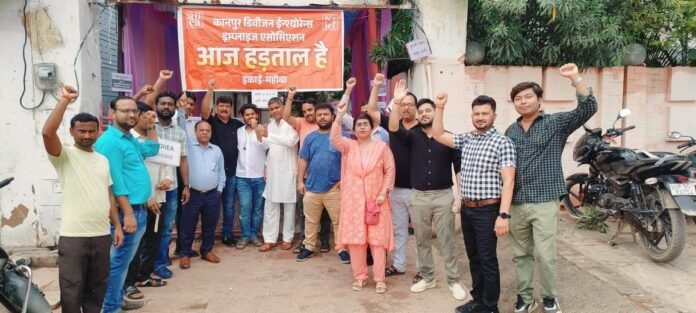 महोबा। कानपुर डिविजन इंश्योरेंस एम्पलाई एसोसिएशन इकाई के बैनर तले भारतीय जीवन बीमा निगम शाखा महोबा के संवर्ग तृतीय व चतुर्थ श्रेणी कर्मचारियों ने अपनी समस्याओं और मांगों के लिए एकजुट होकर आवाज बुलंद करते हुए एक दिवसीय हड़ताल की। बीमा संवर्ग कर्मचारियों ने तृतीय व चतुर्थ श्रेणी पदों की ठेका प्रथा का विरोध करते हुए जल्द भर्ती के साथ जीवन एवं स्वास्थ्य बीमा प्रीमियम पर जीएसटी समाप्त किए जाने सहित तमाम मांगे उठाई।