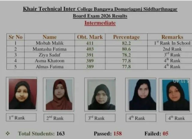 डुमरियागंज सिद्धार्थनगर। खैर टेक्निकल इंटर कॉलेज बनगवां डुमरियागंज के छात्र-छात्राओं ने वर्ष 2026 की इंटरमीडिएट बोर्ड परीक्षा में उत्कृष्ट प्रदर्शन कर विद्यालय और जिले का नाम रोशन किया है।