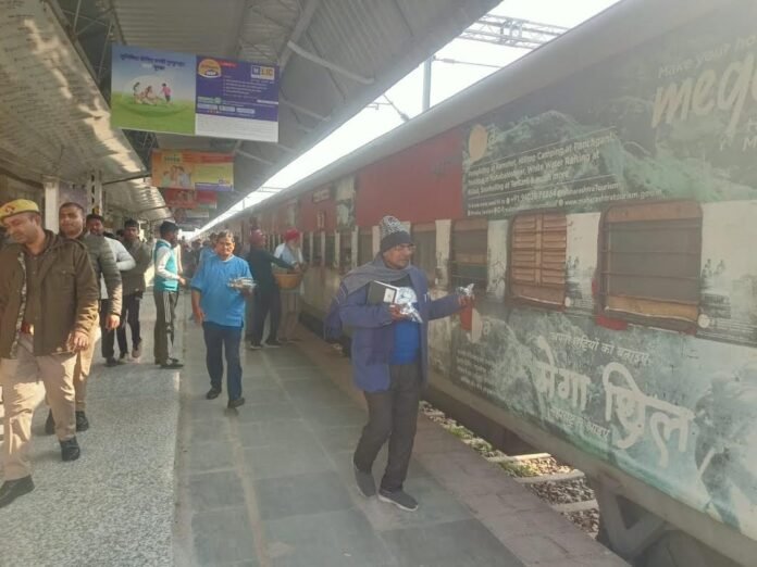 शनिवार को गुनगुनी धूप के बीच सेवादारों ने महमूदपुर में लंगर तैयार किया और दोपहर बाद 1.20बजे पंजाब मेल ट्रेन पर यात्रियों को लंगर का वितरण किया गया।