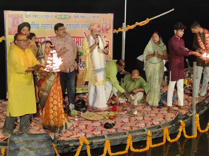 अम्बेडकरनगर बासंतिक नवरात्र के प्रथम दिवस पर नव संवत्सर 2083 विक्रमी का स्वागत बड़ी धूमधाम से किया गया। नव संवत्सर स्वागत समारोह समिति टांडा के तत्वावधान में पतित पावनी मां सरयू की 21,551 दीपों से महा आरती, दुग्धाभिषेक एवं पूजन का भव्य आयोजन सरयू नदी में संपन्न हुआ।शाम 5:30 बजे नदी की जलधारा में नाव पर स्थापित मंच पर ज्योतिषाचार्य पुरोहित पंडित राकेश मिश्रा ने यजमान दंपतियों अंशुल अग्रवाल, सरदार त्रिलोक सिंह एवं दिनेश नारायण सिंह को संकल्प कराकर विधि-विधान से पूजन कराया।