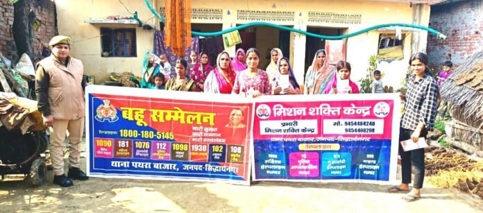 पुलिस अधीक्षक अभिषेक महाजन द्वारा महिलाओं के सुरक्षा एवं जागरूकता अभियान” के संबंध में दिए गए निर्देश के क्रम में प्रशांत कुमार प्रसाद अपर पुलिस अधीक्षक सिद्धार्थनगर व बृजेश कुमार वर्मा क्षेत्राधिकारी डुमरियागंज के कुशल पर्यवेक्षण में सोमवार को थाना अध्यक्ष अमित कुमार थाना पथरा बाजार के निर्देशन मे थाना क्षेत्र के ग्राम खदरी की बहू का जो थाने तक नहीं आ सकती हैं उनको चौपाल लगाकर बहु सम्मेलन कर जागरूक किया तथा प्रधान बिंद्रावती देवी, आंगनवाड़ी राधा देवी, रोजगार सेवक इंद्रजीत व खुद के साथ होने वाले अपराध से बचने के बारे मे जानकारी दी गयी।