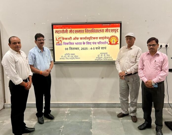 गोरखपुर । महायोगी गोरखनाथ विश्वविद्यालय गोरखपुर (एमजीयूजी) के फार्मेसी संकाय में आरोग्य भारती गोरक्ष प्रांत के सहयोग से सोमवार को एक संगोष्ठी का आयोजन किया गया। मुख्य अतिथि के रूप में आरोग्य भारती के राष्ट्रीय कार्यकारिणी सदस्य एवं विश्व आयुर्वेद मिशन के अध्यक्ष डॉ. जीएस तोमर उपस्थित रहे। उन्होंने विकसित भारत के लिए समाज में पंच परिवर्तनों की आवश्यकता पर विस्तृत व्याख्यान दिया।