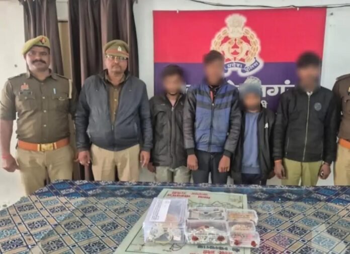 घर के अन्य परिजन भी बाहर थे, जिससे घर खाली था। इसी दौरान अज्ञात चोर रात में घर में घुसे और लाखों रुपये के जेवर व हजारों रुपये की नकदी लेकर फरार हो गए। पुलिस ने मुकदमा दर्ज कर मामले की जांच शुरू कर दी थी। आज सुबह मुखबिर की सूचना पर पुलिस ने इस घटना को अंजाम देने वाले चार चोरों को गिरफ्तार किया।