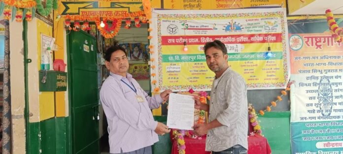 फर्रुखाबाद के विकासखंड कायमगंज क्षेत्र के प्राथमिक विद्यालय मदारपुर में ग्राम प्रधान को त्रिवार्षिक कार्य योजना सौंपते हुए प्रधानाध्यापक राजकिशोर शुक्ल – प्राथमिक विद्यालय मदारपुर में स्कूल प्रबंधन समिति की बैठक में शासन के निर्देश पर स्कूल की त्रिवार्षिक कार्य योजना को ग्राम प्रधान प्रतिमा वर्मा के पति सूर्य कुमार सिंह वर्मा को सौंपते हुए प्रधानाध्यापक ने कायाकल्प के अधूरे कार्यों को पूरा कराने के साथ ही साथ स्कूल में बच्चों के लिए जरूरी संसाधन उपलब्ध कराने का अनुरोध किया। उधर स्कूल में चल रही वार्षिक परीक्षा का खंड शिक्षा अधिकारी ओमप्रकाश पाल ने निरीक्षण कर परीक्षा व्यवस्था देखी। कक्षा 5 में 18 में 16, चार में 15 में 14, तीन में 9 में 9 , दो में 13 में 11 और एक में 10 में 8 बच्चे उपस्थित मिले। सभी कक्षाओं में बच्चे सीटिंग प्लान के अनुसार बैठ कर परीक्षा दे रहे थे। प्रधानाध्यापक राजकिशोर शुक्ल ने बताया कि आज नैतिक शिक्षा का पेपर है। पेपर न मिलने पर प्रश्न पत्र बोर्ड पर लिखा गया।