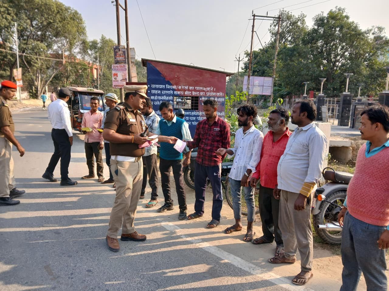 सिद्धार्थनगर। पुलिस अधीक्षक जनपद डाo अभिषेक महाजन के आदेश के अनुपालन के क्रम में अपर पुलिस अधीक्षक प्रशांत कुमार प्रसाद के निर्देशन मे, सहायक पुलिस अधीक्षक/क्षेत्राधिकारी यातायात विश्वजीत शौर्ययान के कुशल पर्यवेक्षण मे प्रभारी यातायात मय टीम द्वारा यातायात माह के तहत हाईडिल तिराहा, सिद्धार्थ तिराहा, पेट्रोल पम्प तिराहा, स्वामी विवेकानंद चौक से सनई चौराहा, साड़ी तिराहा, कस्बा बाँसी, बाँसी रोडवेज आदि स्थानों पर पीए सिस्टम से आम जनमानस को यातायात नियमों के प्रति जागरूक करते हुए पम्पलेट्स वितरण किया गया एवं कुहरो मे दुर्घटना से बचाव हेतु वाहनों पर रिफ़लेक्टर टेप लगाया गया साथ ही विशेष अभियान के तहत सघन चेकिंग अभियान चलाकर दो पहिया पर तीन सवारी/ बिना हेलमेट वाहन चलाना, चार पहिया वाहनों मे सीट बेल्ट का प्रयोग न करना, सड़कों के किनारे अवैध रूप से खड़े-खड़े वाहनों जिसे दुर्घटना के प्रबल संभावना थी उनका M. V. Act, के तहत चालान करते हुए कुल 127करते हुये 138500 रूपये शमन शुल्क की कार्यवाही की गयी तथा प्रत्येक दशा मे यातायात नियमों का पालन करने हेतु प्रेरित किया गया, जिससे होने वाली सड़क दुर्घटनाओ की संख्या मे भारी कमी लायी जा सके।