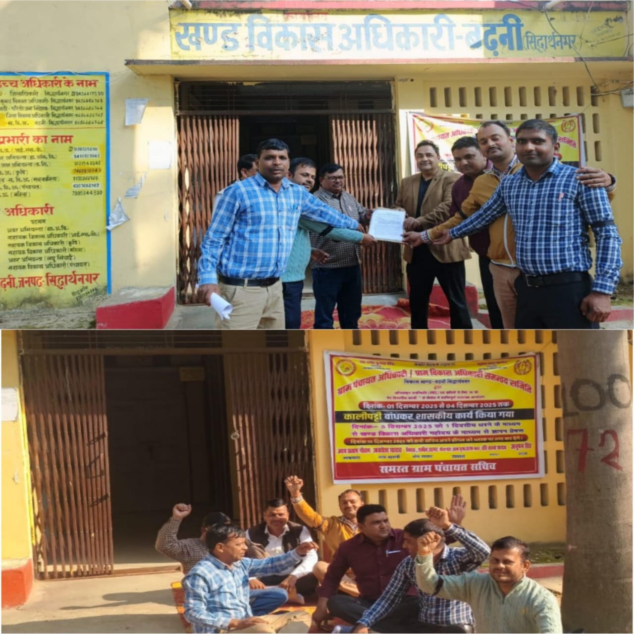 यूपी सरकार द्वारा लागू आनलाइन उपस्थित से नाराज़ सचिवों ने आदेश के विरोध में प्रांतीय नेतृत्व के निर्देश के क्रम में चलाए जा रहे क्रमिक आंदोलन के तहत ग्राम पंचायत अधिकारी एवं ग्राम विकास अधिकारी समन्वय समिति, सिद्धार्थनगर के तत्वावधान में जनपद के समस्त विकास खण्डों में दिनांक 01-12-2025 से 04-12-2025 तक काली पट्टी बांधकर विरोध जताया गया।