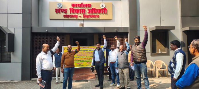 शोहरतगढ़ सिद्धार्थनगर। ग्राम पंचायत अधिकारी/ग्राम विकास अधिकारी समन्वय समिति के बैनर तले मंगलवार को शोहरतगढ़ ब्लॉक मुख्यालय पर सचिवों ने ऑनलाइन उपस्थिति (एफ.आर.एस.) प्रणाली एवं गैर विभागीय कार्यों के भार के विरोध में शांतिपूर्ण प्रदर्शन किया। सभी सचिवों ने हाथों में काली पट्टी बांधकर अपना रोष प्रकट किया।