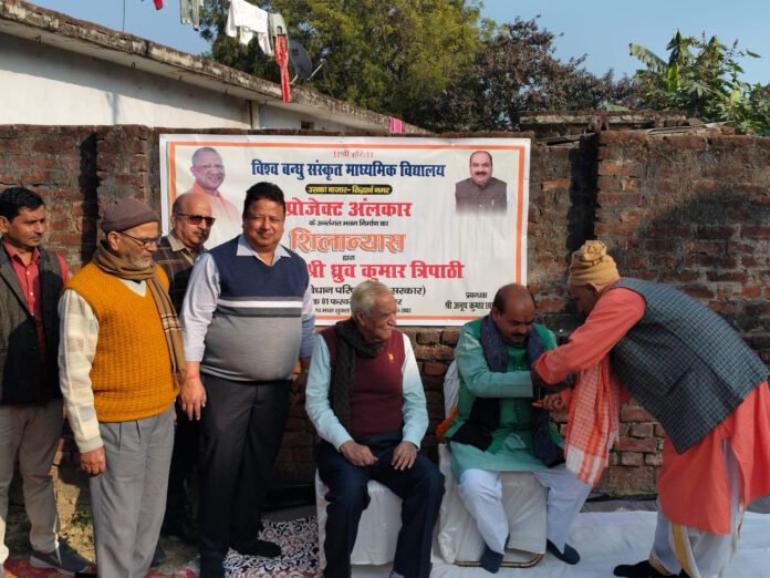 उसका बाजार सिद्धार्थनगर।स्थानीय कस्बा अन्तर्गत स्थित विश्वबंधु संस्कृत माध्यमिक विद्यालय घुघुलिया के जर्जर हो चुके भवन के ध्वस्तीकरण के बाद नए भवन के निर्माण हेतु “प्रोजेक्ट अलंकार” के तहत शिक्षक विधायक ध्रुव कुमार त्रिपाठी ने रविवार को शिलान्यास किया।