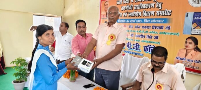 टांडा अम्बेडकरनगर योगी आदित्यनाथ मुख्यमंत्री उत्तर प्रदेश की महत्त्वाकांक्षी योजना के तहत सभी छात्रों के हाथों में पढ़ने के लिए पुस्तकों के अलावा ज्ञान के सागर स्मार्ट फोन और टैबलेट सभी के लिए उपलब्ध हो और अध्ययनरत युवाओं के तकनीकी सशक्तिकरण हेतु टेबलेट एवं स्मार्टफोन वितरण समारोह दिनांक-24 मार्च 2025, दिन सोमवार को आयोजित किया गया l मुख्य अतिथि- प्रो0 ओम प्रकाश लिपाठी पूर्व विभागाध्यक्ष समाजशास्त्र बी0एन0के0बी0पी0जी0 कॉलेज अम्बेडकरनगर एवं अध्यक्षता में अम्बरीष सिंह नायब तहसीलदार टाण्डा, अम्बेडकरनगर मौजूद रहे l
