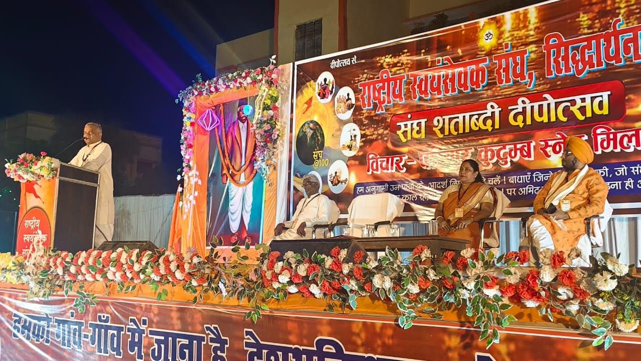 सिद्धार्थनगर। राष्ट्रीय स्वयंसेवक संघ द्वारा रविवार को रघुवर प्रसाद जायसवाल सरस्वती शिशु मंदिर इंटर कॉलेज में कुटुंब प्रबोधन स्नेह मिलन कार्यक्रम में दीपोत्सव से राष्ट्रोत्सव का आयोजन किया गया। कार्यक्रम के मुख्य वक्ता संघ के प्रांत प्रचारक रमेश ने कहा कि भारतीय समाज की मूल इकाई व्यक्ति नहीं, बल्कि कुटुंब है। कृषि, संस्कृति, संस्कार और नैतिकता यही भारतीय जीवन के आधार स्तंभ हैं। कहा कि संघ कीडॉ‘वसुधैव कुटुम्बकम्’ के सिद्धांत को सर्वोपरि मानता है, जो संपूर्ण विश्व को एक परिवार के रूप में देखने की भावना देता है। यह दृष्टिकोण भारत की प्राचीन सोच और वैश्विक कल्याण के आदर्श का प्रतीक है।