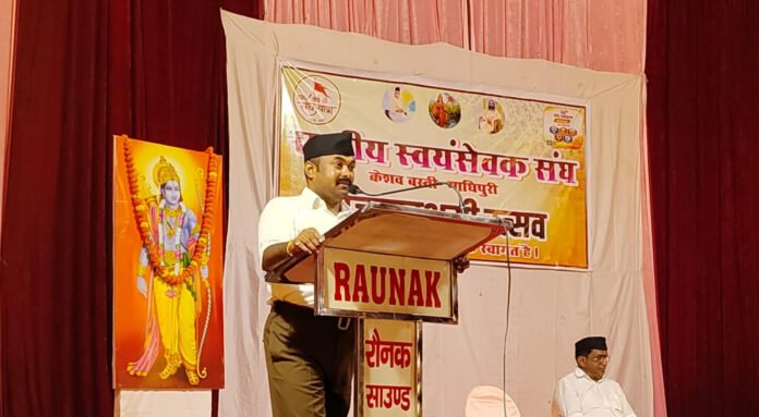 गाजीपुर। राष्ट्रीय स्वयंसेवक संघ के शताब्दी वर्ष के विजयदशमी उत्सव के उदघाटन सत्र में बुधवार को नगर के भाऊराव देवरस बस्ती के विवेकानन्द शाखा का विजयदशमी उत्सव आमघट स्थित स्थानीय मैरेजहाल के प्रांगण मे मनाया गया। उत्सव में मुख्य अतिथि काशीप्रान्त प्रचारक रमेश ने सर्वप्रथम भारत माता व संघ के संस्थापक डा. केशव बलिराम हेडगेवार व माधव सदाशिवराव गोलवरकर के चित्र पर पुष्प अर्पित कर दीप प्रज्जवलित किया। राष्ट्रीय स्वयंसेवक संघ की स्थापना की जरूरत क्यो पड़ी उसपर विस्तार से प्रकाश डालते हुए बताया कि भारव वर्ष हमारा छोटे छोटे राज्यो मे विभक्त था जिससे कई बाहरी आक्रान्ता आये और उन छोटे छोटे राज्यो को संगठित न होने से अपने राज्य का विस्तार करने लगे जिससे हिन्दु परम्परा व संस्कृति का हृास हुआ और हिन्दुओ का पतन हुआ।
