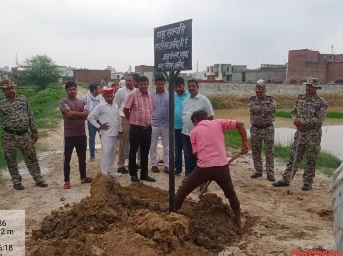 अलीगढ़। नगर आयुक्त प्रेम प्रकाश मीणा के निर्देश पर नगर निगम के संपत्ति विभाग द्वारा आज बड़ी कार्रवाई करते हुए ग्राम असादपुर कायम स्थित गाटा संख्या 181 की 4910 वर्ग मीटर सरकारी ऊसर भूमि को कब्जा मुक्त कराते हुए नगर निगम संपत्ति का बोर्ड लगाया गया। इसके साथ ही गाटा संख्या 271 पर स्थित सरकारी भूमि पर भी नगर निगम संपत्ति का बोर्ड स्थापित किया गया।