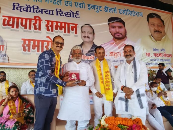 उरई(जालौन)। उरई स्थित “दिवौलिया रिसोर्ट” में आयोजित ‘व्यापारी सम्मान समारोह’ में जिले के प्रतिष्ठित व्यापारियों को उनके अथक परिश्रम और ईमानदारी के लिए सम्मानित किया गया। यह आयोजन भारतीय उद्योग व्यापार प्रतिनिधि मण्डल एवं एग्रो इनपुट डीलर्स एसोसिऐशन के संयुक्त तत्वावधान में हुआ। दीप प्रज्वलित कर समारोह में उपस्थित बड़ी संख्या में व्यापारियों को संबोधित करते हुए मुख्य अतिथि जलशक्ति मंत्री स्वतंत्र देव सिंह ने कहा कि उत्तर प्रदेश की आर्थिक प्रगति के पहिए को गति देने में व्यापारियों की महत्वपूर्ण भूमिका है।