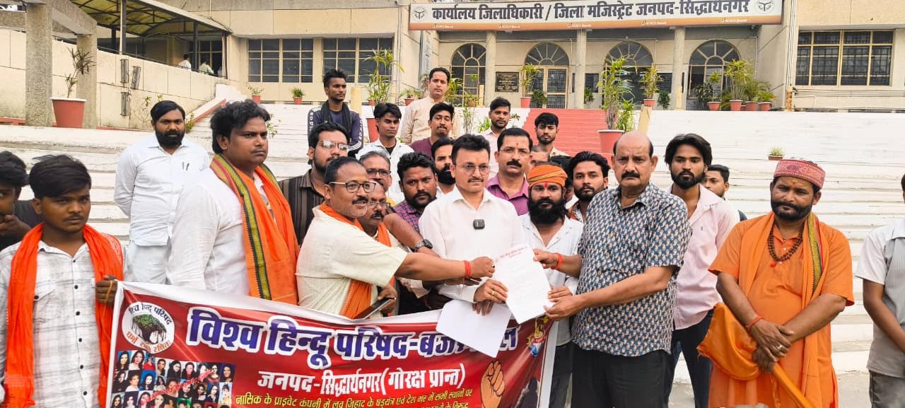 सिद्धार्थनगर। देश में बढ़ती विकृत जिहादी मानसिकता, अवैध कब्जों एवं सुनियोजित षड्यंत्रों के विरुद्ध कठोर कार्रवाई हेतु शुक्रवार को विश्व हिन्दू परिषद- बजरंगदल के कार्यकर्ताओं ने राष्ट्रपति को सम्बोधित ज्ञापन जिलाधिकारी को सौंपा है। ज्ञापन के माध्यम से विहिप ने मांग किया है कि ऐसी राष्ट्र विरोधी और आपराधिक मानसिकता वाले तत्वों को चिह्नित कर उनके विरुद्ध त्वरित एवं कठोर दंडात्मक कार्रवाई सुनिश्चित की जाए, सार्वजनिक एवं सरकारी भूमि पर हुए सभी अवैध कब्जों को तत्काल हटाया जाए, लव जिहाद और जबरन धर्मातरण जैसे कृत्यों को रोकने हेतु कठोर केंद्रीय कानून लागू किया जाए, जनजातीय क्षेत्रों में हो रहे शोषण को रोकने हेतु विशेष सुरक्षा तंत्र विकसित किया जाए, विश्व हिंदू परिषद राष्ट्र की एकता और अखंडता के लिए प्रतिबद्ध है।