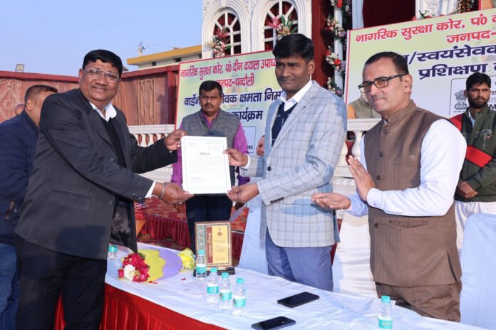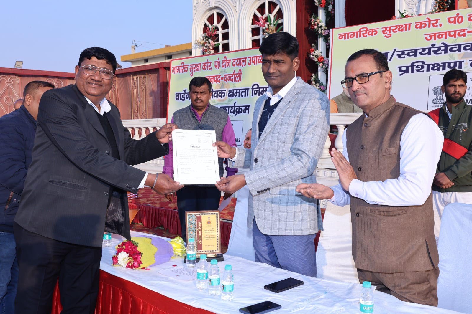 चन्दौली। भारत सरकार गृह मंत्रालय द्वारा प्रायोजित नागरिक सुरक्षा के वार्डन एवं स्वयंसेवको का क्षमता निर्माण प्रशिक्षण के चतुर्थ सत्र के साथ सम्पूर्ण समापन अलीनगर स्थित प्रशिक्षण स्थल में सम्पन्न हुआ। मुख्य अतिथियों द्वारा समापन समारोह में चौथे बैच के सभी 90 प्रशिक्षणार्थियों को सर्टिफिकेट, आई कार्ड, पेन ड्राइव देकर सम्मानित किया गया।
