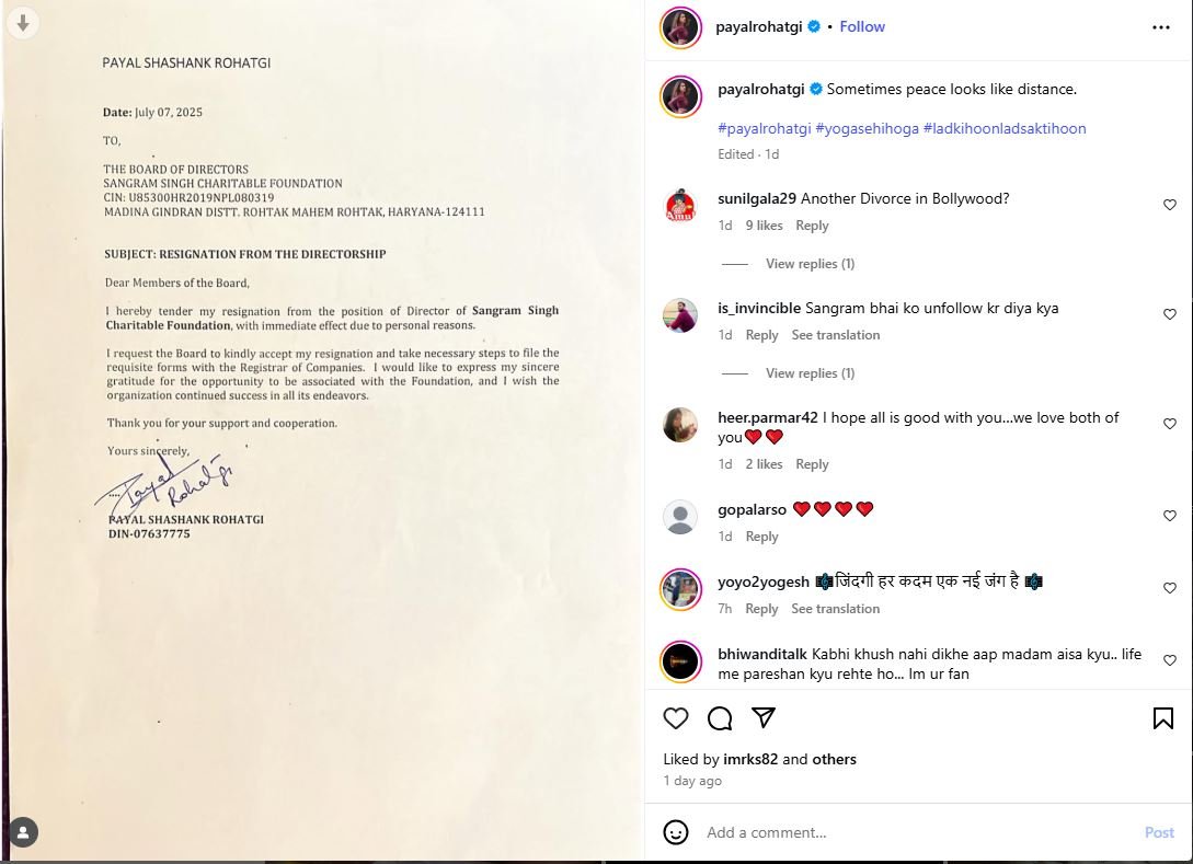 दरअसल, ‘ढोल’ फिल्म एक्ट्रेस ने बीते दिन अपने आधिकारिक इंस्टाग्राम पर एक स्टेटमेंट जारी किया था, जिसमें उन्होंने बताया था कि वह संग्राम सिंह चेरिटेबल फाउंडेशन के चेयरपर्सन के रूप में रिजाइन कर रही हैं। ये पोस्ट तक तो ठीक था, लेकिन पायल ने जो कैप्शन में लिखा, उससे सोशल मीडिया पर फैंस ये अंदाजा लगाने लगे कि टीवी की दुनिया में एक और तलाक हो रहा है। पायल ने लिखा था, “कभी-कभी शांति दूरियों में होती है”।