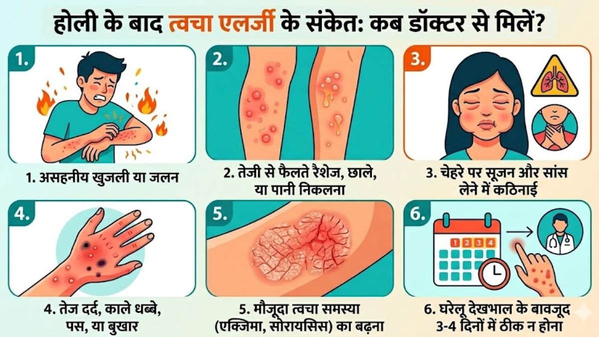 अगर होली के बाद त्वचा में खुजली या जलन बहुत ज्यादा बढ़ जाए और सहन करना मुश्किल हो जाए, तो यह किसी एलर्जिक रिएक्शन का संकेत हो सकता है। ऐसे में तुरंत डॉक्टर से संपर्क करना चाहिए। इसके अलावा अगर रैशेज तेजी से फैलने लगें, त्वचा पर छाले बन जाएं या उनमें से पानी निकलने लगे, तो यह त्वचा की गंभीर एलर्जी या इन्फेक्शन का संकेत हो सकता है।