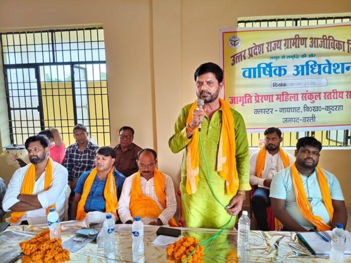 कुदरहा, बस्ती। नगर पंचायत गायघाट के झारखंडेश्वर नाथ शिव मंदिर परिसर में बुधवार को वार्षिक अधिवेशन जागृति आजीविका महिला संकुल स्तरीय समिति कलेक्टर गायघाट द्वारा आयोजित किया गया। कार्यक्रम का शुभारंभ मुख्य अतिथि ब्लाक प्रमुख अनिल दुबे,भाजपा पिछड़ा मोर्चा जिलाध्यक्ष ब्रह्मदेव यादव देव, नगर पंचायत अध्यक्ष प्रतिनिधि बालकृष्ण त्रिपाठी पिंटू व खंड विकास अधिकारी आलोक कुमार पंकज ने पंडित दीनदयाल उपाध्याय व श्यामा प्रसाद मुखर्जी के चित्र पर मल्यार्पण व दीप प्रज्वलित कर किया। कार्यक्रम में अच्छा प्रदर्शन करने वाली समूह के बेस्ट कैडर को मुख्य अतिथि ने स्मृति चिन्ह देकर सम्मानित किया।